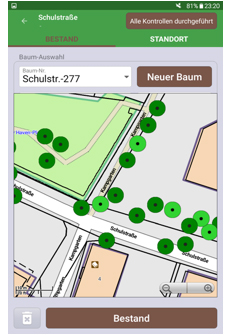- Bäume werden auf der Karte symbolisch dargestellt und je